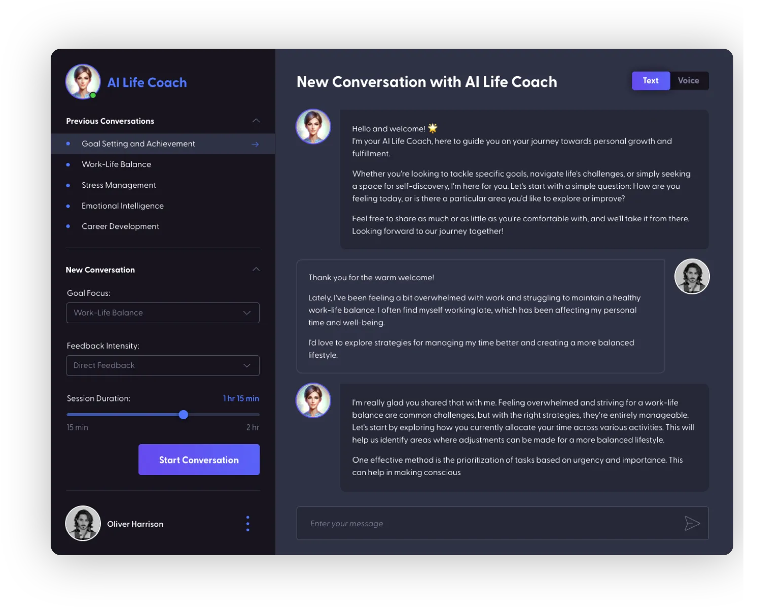 Whether you want to improve your leadership skills, motivate yourself, climb up career-wise, have healthier relationships, be more confident, or just gain better habits and balance in your life, Transformity AI has all the answers. This virtual coach is programmed to give you personalized guidance that aligns with your unique goals.
